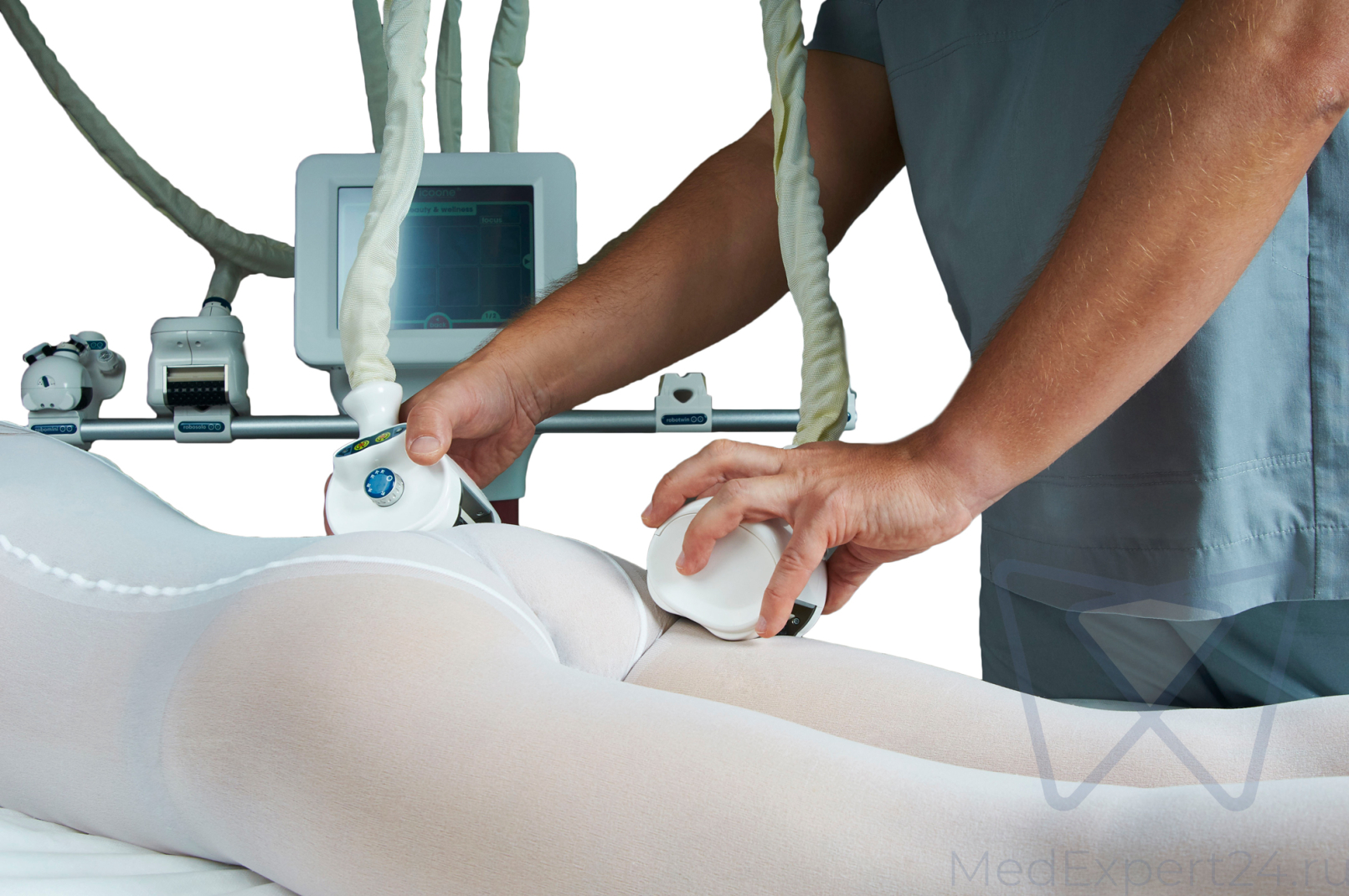 | Две манипулы Robotwins с уникальной технологией Roboderm. Только у аппарата Icoone встречаются подобные насадки. Они симметрично воздействуют на выбранные области с большей скоростью и эффективностью, чем одна манипула.
