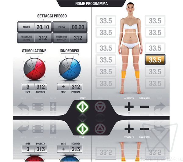 - В аппарате предустановлено: шесть программ для всего тела, двенадцать для нижних конечностей, четыре для верхних и три тестовых в общей сложности 26 алгоритмов. При этом есть возможность создания индивидуальных программ, рассчитанных под каждый клинический случай,