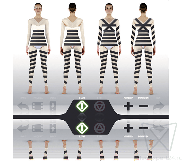 На тело накладываются бинты, которые для прохождения импульсов пропитываются физраствором. По бинтам равномерно распределяется лента-электрод. Сверху надеваются манжеты, которые при накачивании воздуха плотно прижимают электроды к телу.