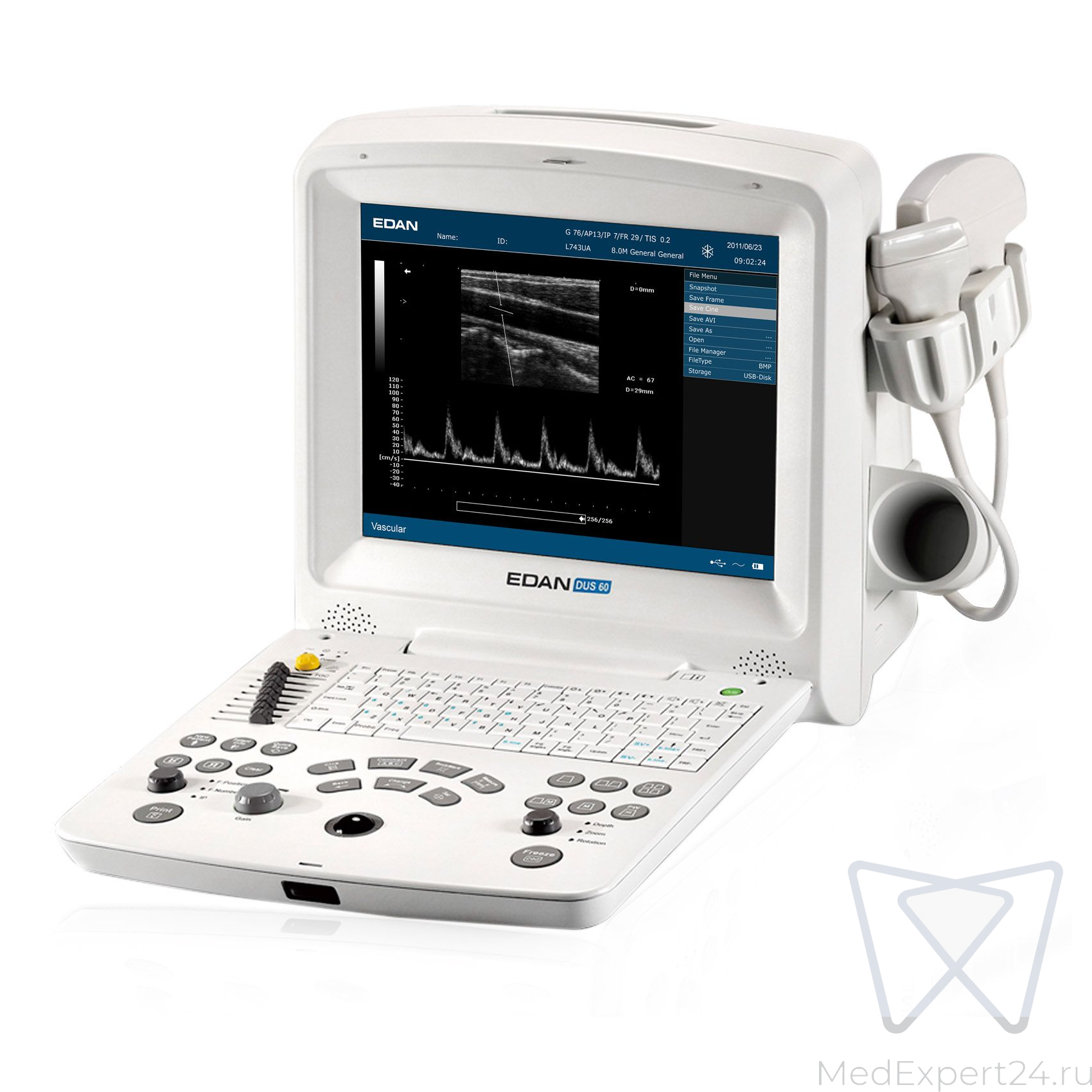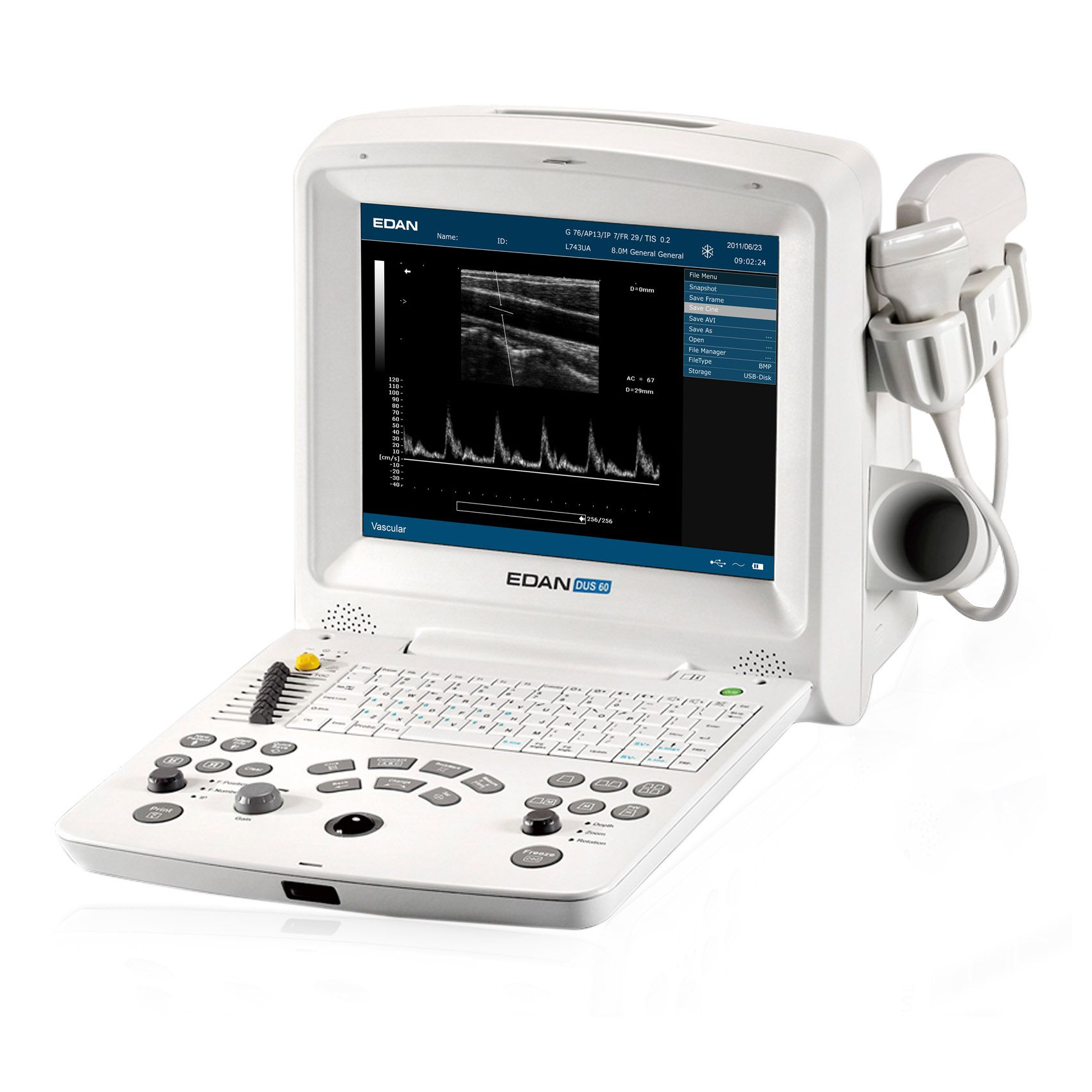 Dus 60 портативный многофункциональный УЗ-сканер для различных исследований. Интуитивная и простая система для УЗ-сканирования. Высокое качество снимков для детального изучения органов и тканей с помощью высококачественного цветного дисплея.