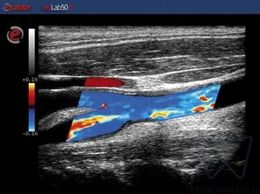 - Дуплексный режим строит плоское изображение в 2D и отображает просвет и стенки сосудов,