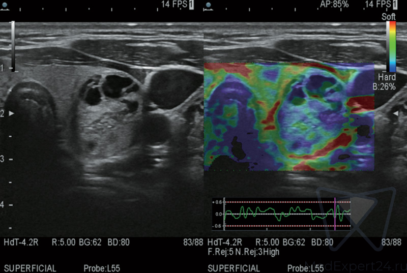 - RTE цветная эластография с количественным анализом и гистограммой Strain,