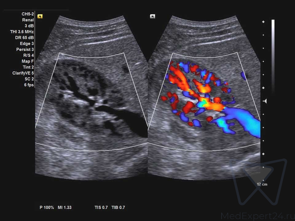 - Позволяет выделять цветом характер кровотока в ROI (области интереса) Обычно применяется в сердечно - сосудистых исследованиях. Кровяной поток, идущий от датчика, отображается синим цветом, к датчику красным. Сине-зелено-желтым цветом выделяется турбулентный поток.
