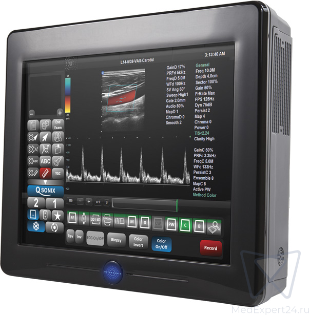- Сенсорный экран легко настраивается в соответствии с потребностями специалиста. Управление осуществляется за счет кнопок на консоле. Кроме того, интерфейс ультразвуковой системы способен отображать только те настройки, которые связаны с текущим исследованием.