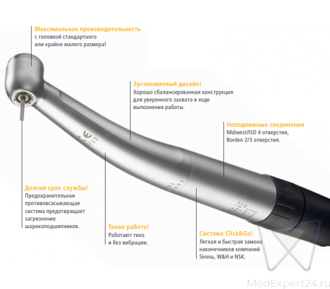 | Предохранительная противовсасывающая система предотвращает засасывание слюны. Это предохраняет шарикоподшипники и зажимной патрон от загрязнения и гарантирует долгий срок жизни. | |
