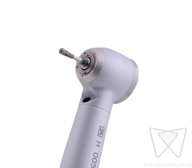 Мощный турбинный наконечник без подсветки с кнопочным зажимом для боров, с боковой струйной системой охлаждения препарационного инструмента.