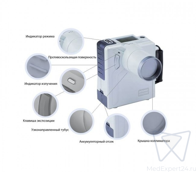Работа от съемного аккумулятора, а опционально можно приобрести и второй, учет количества сделанных снимков, пульт дистанционного управления, возможность сделать без подзарядки более 350 экспозиций, уникальный рентгенозащитный экран – вот ещё несколько причин остановить свой выбор на этой модели. А закончить краткое описание этого портативного рентген-аппарата можно упомянув то, что разумеется он имеет все необходимые регистрационные документы, необходимые для его легального использования в вашей практике и конечно подробную русскоязычную инструкцию по эксплуатации и технический паспорт.