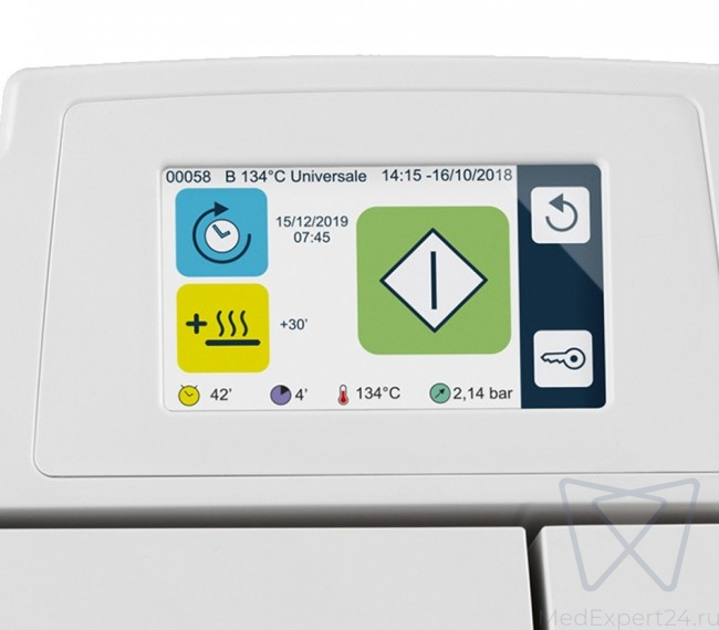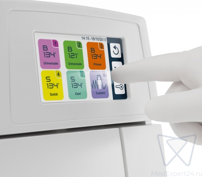 4,3-дюймовый цветной сенсорный экран с удобным интерфейсом. Каждый элемент управления соответствует значкам, которые обеспечивают немедленное считывание показателей автоклава.
