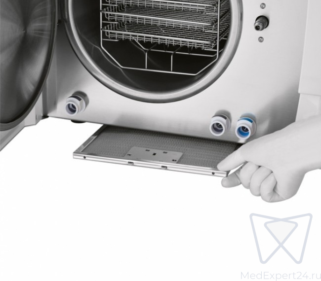 Система фильтрации Futura гарантирует беспрецедентную простоту эксплуатации. В отличие от традиционных стерилизаторов, Futura не требует наружного подключения к воде для очистки. Благодаря фильтру деминерализации на главном резервуаре вы сможете заполнить его чистой водопроводной водой, что значительно оптимизирует пространство, оптимизирует процессы и обеспечит значительную экономию. Повреждения внутренних компонентов аппарата, вызванные плохим качеством воды, останутся в прошлом.