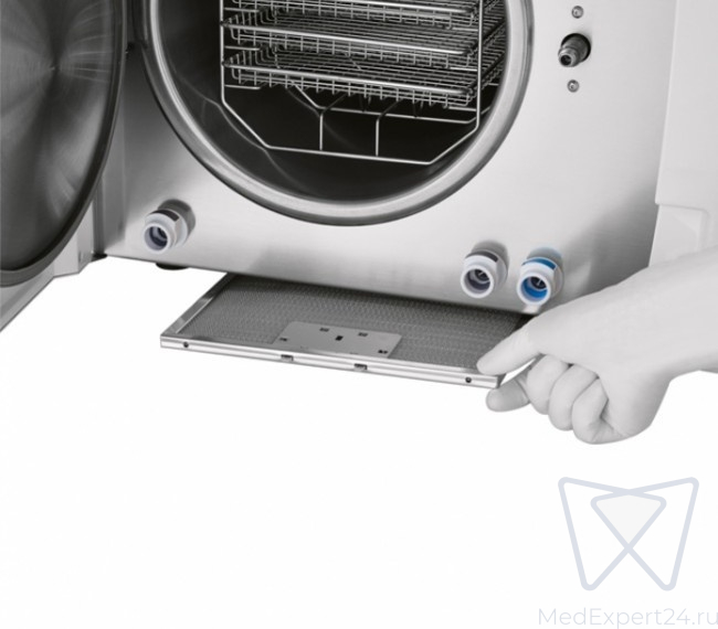 Двери в верхней части стерилизатора позволяют оператору добраться до резервуаров, что позволяет их заполнить деминерализованной водой и очистить. Датчик в баке проверяет качество воды, чтобы обеспечить правильную и продолжительную работу машины. В качестве альтернативы верхней загрузке передние быстроразъемные соединения могут использоваться для опорожнения резервуаров и подачи деминерализованной воды.
