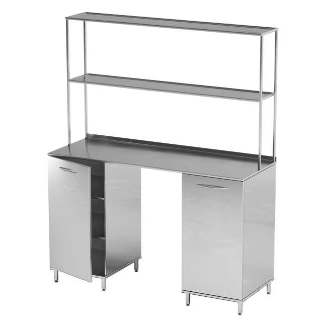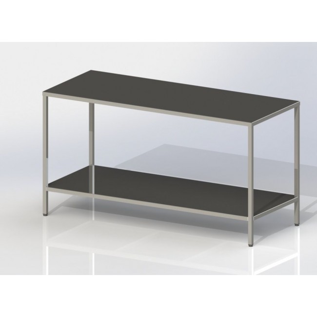 Cтол на металлическом каркасе, столешница и полка из нержавеющей стали