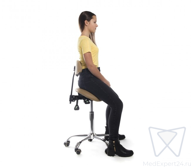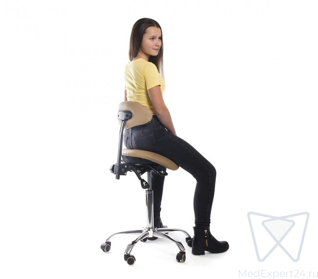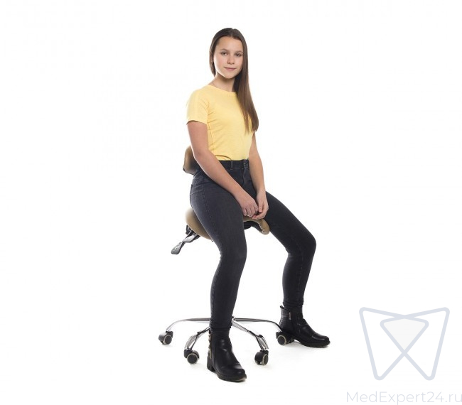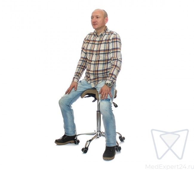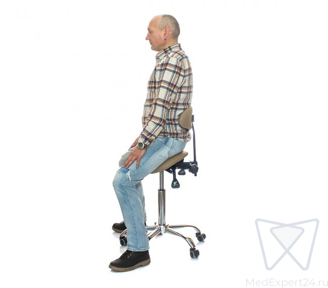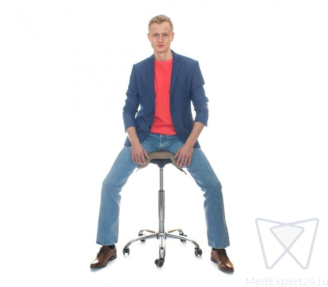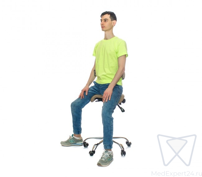 На стуле-седле мы не сидим полностью, а занимаем промежуточное положение между стоячим и сидячим. При этом угол между бедром и позвоночником получается около 135 градусов, а ноги расставлены в стороны. Это поза наездника. Самая естественная для человека среди всех сидячих поз.