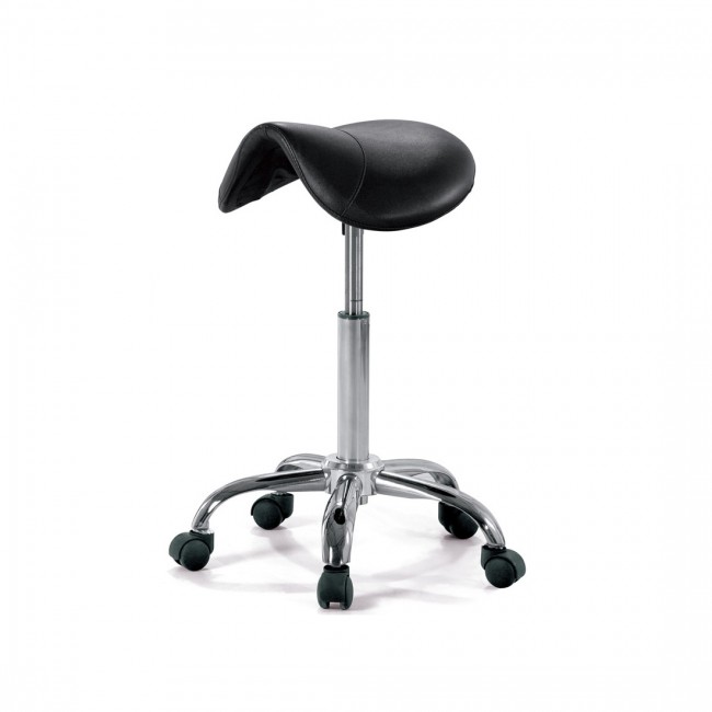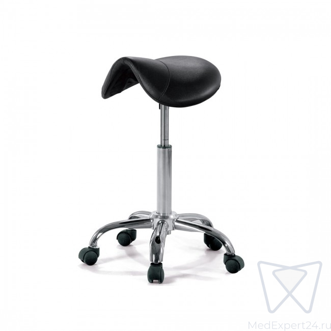 Стул к стоматологической установке, седловидной формы для сохранения здоровья вашего позвоночника. На металлическом основании, с функцией регулировки высоты. Снабжен роликами для комфортного перемещения.