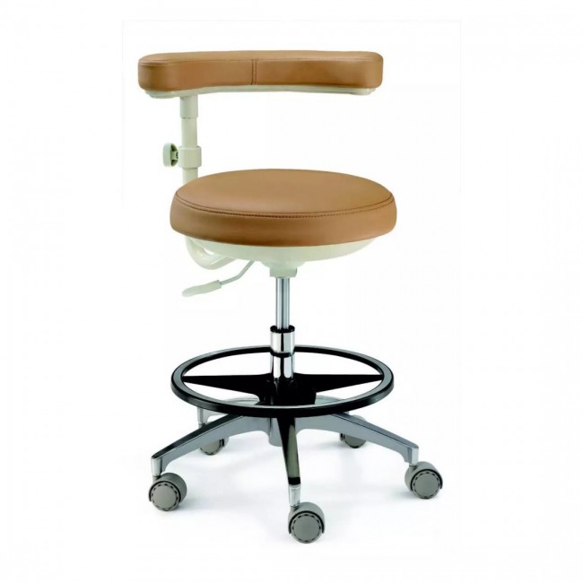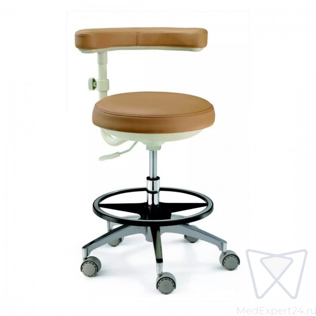 Стул к стоматологической установке. С абдоминальным упором. С опорой (в виде кольца) для ног. На металлическом основании,с регулирующейся высотой сидения и отдельной регулировкой высоты спинки. Снабжен роликами для комфортного перемещения.