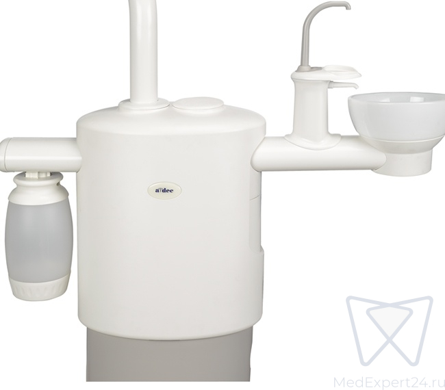 С подготовкой под вакуумную помпу для влажной аспирации, есть автоматический определитель влаги. Крепление справа, либо слева от кресла. Плевательница – стеклянная круглая, с системой смыва чаши и наполнения стакана. Емкость автономной воды – 2 литра. Управление гидроблоком может осуществляться как врачом, так и ассистентом. Два крана 026.158.00.