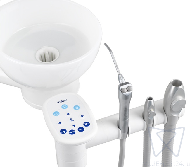 Оснащен слюноотсосом и пылесосом, автоклавируемым пистолетом «вода/воздух/спрей». Сенсорный программируемый пульт управления креслом, гидроблоком и светильником. Вакуумные шланги EasyFlex уменьшают усталость в руке и запястье.