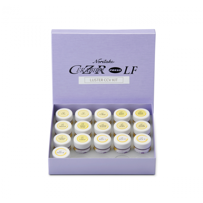 CZR Press LF Luster CCV Kit - набор специальных люстровых эффектов используется для достижения эстетического эффекта внешнего вида зуба. Люстровый фарфор, входящий в состав, позволяет создать практически идентичную натуральной окраску зуба и придать естественный блеск эмали. Уникальные частицы, распределенные по поверхности коронки, позволяют обеспечить частичное отражение света от этой поверхности, благодаря чему зубной протез имеет опалесценцию, подобную наблюдаемой у натуральных зубов